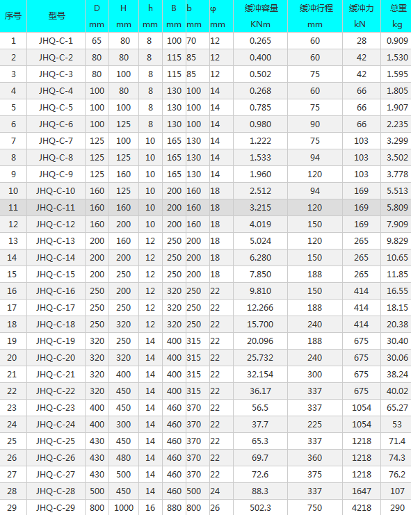 起重机用ZLA型缓冲器性能表